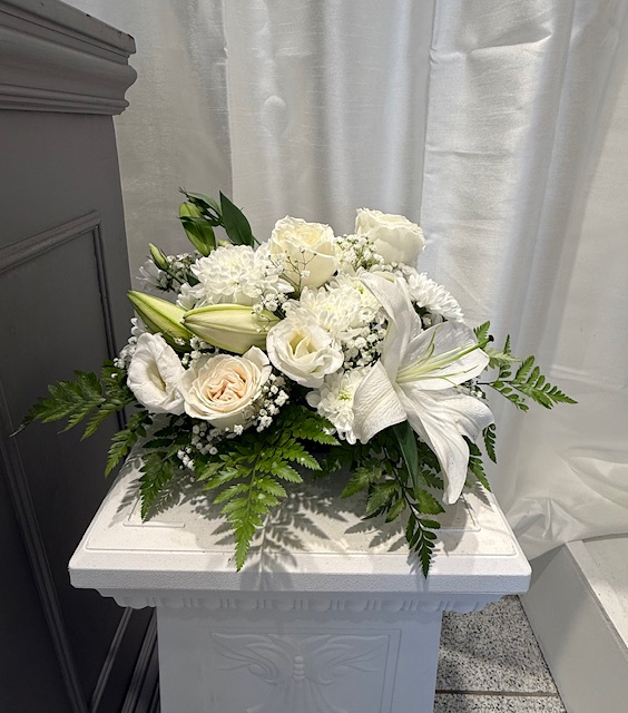 Honor the memory of a loved one with this elegant, all-white coffee table funeral arrangement. Compact yet beautifully crafted, it’s the perfect tribute for intimate spaces or personal remembrance. Hand-arranged by a trusted Blooms of Brampton – Brampton florist, this delicate bouquet of white blooms symbolizes peace, purity, and heartfelt condolences. Ideal for home memorials or sending comfort, this tasteful arrangement offers a gentle, thoughtful way to show your sympathy.