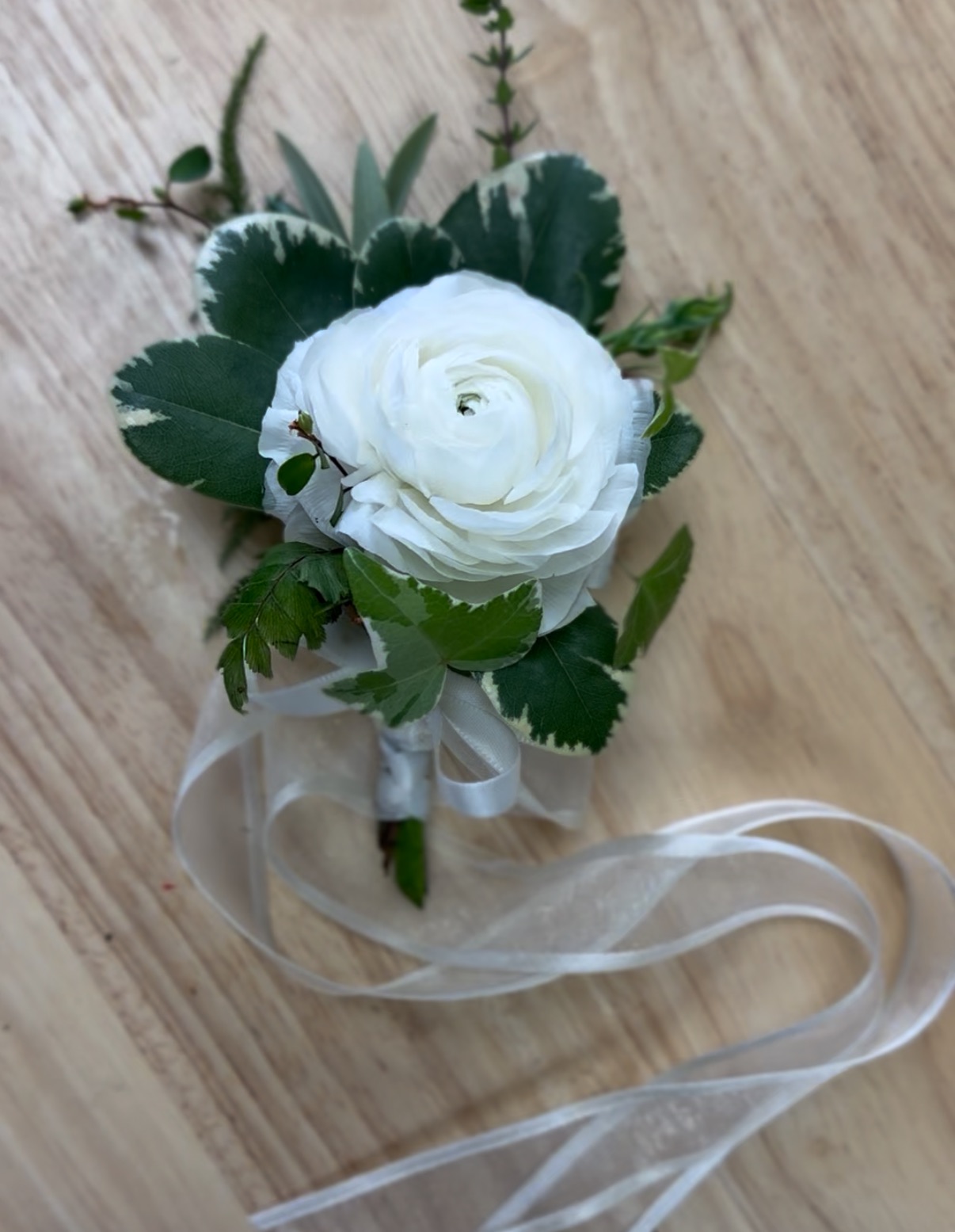 Graceful and romantic, this wrist corsage features a delicate ranunculus bloom surrounded by soft greenery, creating a timeless and elegant look. Finished with a beautiful ribbon to securely tie around the wrist, it’s the perfect floral accessory for weddings, proms, or any special celebration.