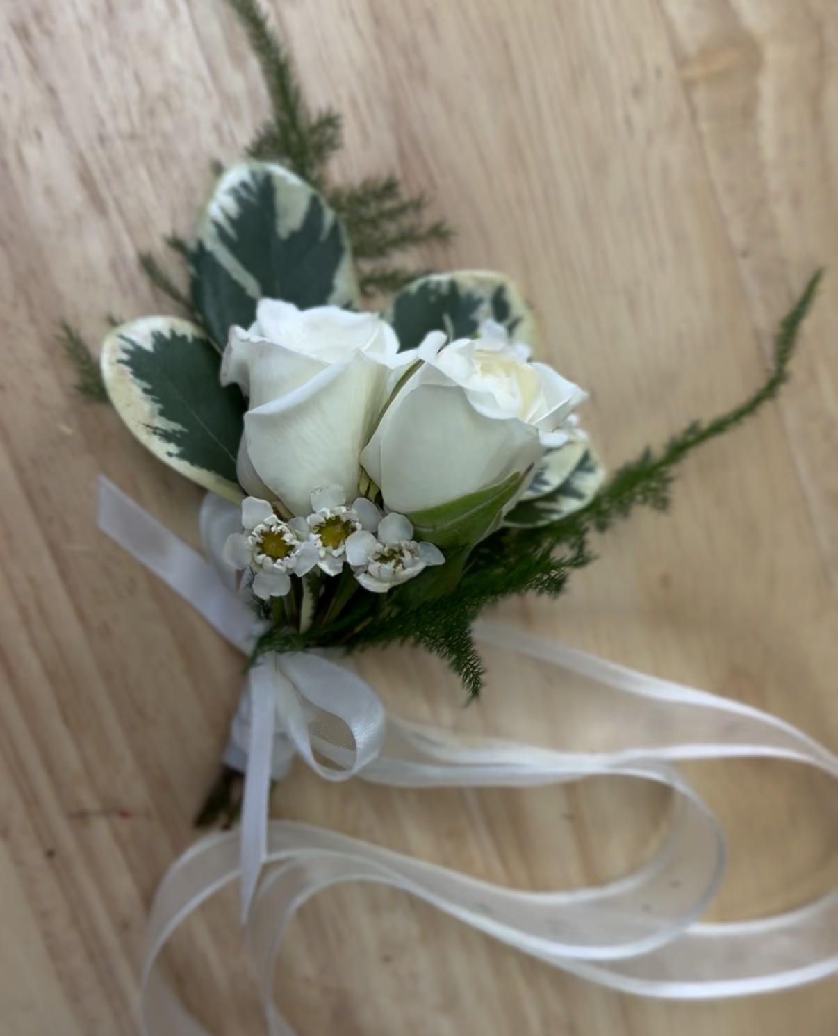 Elevate your special occasion with this elegant wrist corsage featuring delicate mini roses, artfully arranged with a lush array of refined greenery. Finished with a beautiful ribbon for a secure and graceful fit, it’s the perfect floral accessory for proms, weddings, or any formal event.
